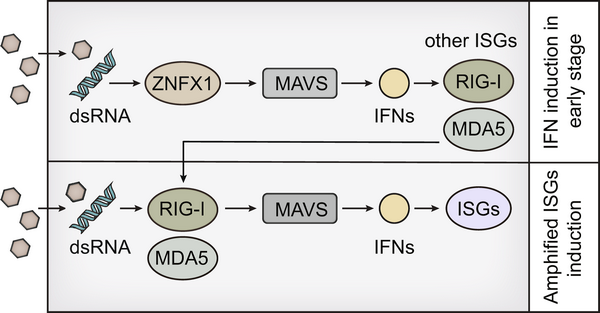在此基础上,课题组进一步对IVT-SAPAS的测序数据进行深度挖掘,并利用siRNA筛选了数十个在病毒感染后发生表达量显著变化的基因,发现RNA解旋酶SF1家族成员ZNFX1具有显著抑制RNA病毒复制的功能。进一步功能分析表明,ZNFX1是一个干扰素诱导基因(interferon stimulated gene, ISG),定位于线粒体外膜上。病毒感染后,ZNFX1通过ARM和P-loop结构域结合病毒的dsRNA,并与定于线粒体的接头分子MAVS相互作用,激活I型干扰素信号通路,发挥抑制RNA病毒复制的功能。由于在静息状态下,ZNFX1具有较高本底蛋白表达,提示ZNFX1在RNA病毒感染早期阶段,即可通过诱导IFNs和ISGs表达形成对RLRs信号通路的正反馈调节。