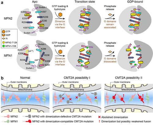 为了解答这些问题,高嵩教授课题组进对MFN2介导线粒体融合的具体机制进行了深入探究。经过不断尝试,团队成功解出了人类MFN2片段在不同GTP水解状态下的晶体结构。团队进一步研究发现:在灵长类动物中,MFN2在催化水解GTP的过程中形成紧密的二聚体,即使在水解过程完成后仍不解离。MFN2的这种特性与催化后GTP水解后迅速解离的MFN1二聚体具有极大差别,因而MFN2比MFN1具有更强的膜栓连能力。有意思的是,MFN2和MFN1的这种差别很大程度上是由一个单氨基酸的差异决定的。此外,该研究还表明MFN2和MFN1可以通过GTP酶结构域形成异源二聚体,并且其形成效率不低于MFN1或MFN2的同源二聚体,提示这种异源二聚体可能在线粒体融合过程中发挥重要功能。MFN2的突变与一种目前尚无法治愈的遗传退行性疾病——IIA型进行性腓骨肌萎缩症(CMT2A)——的发生密切相关。根据MFN2的上述特性,高嵩教授课题组进一步检测了MFN2致病突变对其生化功能的影响,探讨了MFN2突变导致CMT2A发生的机制。