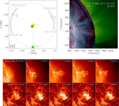 图4:不同视角对同一暗条爆发的观测,可以看出暗条爆发过程中的旋转