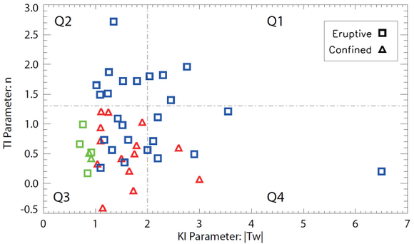 大气科学学院周振军副研究员及合作者通过分析2010年7月至2013年2月的16个失败太阳暗条爆发的磁场和三维爆发形态,给出了控制磁绳爆发的关键参量,除了经典的衰减因子以外,暗条顶部的旋转也是其中的一个重要影响因素。通过构建衰减因子和旋转角度的相空间分布,他们发现达到或超过衰减因子之后,所有的爆发都具有强的旋转(50°到130°)。这种旋转可能引发内部或者外部的磁场重联,进而破坏磁绳的结构,并最终导致失败爆发。这一成果说明磁场重联在决定磁绳是否爆发中起到了重要作用,突破了原有的单一控制因素决定磁绳爆发的理论。