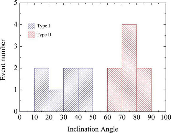 图2:两类束缚耀斑中耀斑后环的倾斜角分布