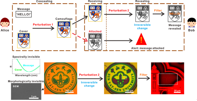 该团队利用两步微扰的方法提出了具有自我反监察功能的纳米隐写术(如上图所示)。首先,信息发送者利用微扰1将重要信息近完美地隐藏在彩色图形中。在目标接收者收到信息载体后,他们需要先对其加载微扰2使得隐藏信息与背景之间出现微小的光谱偏移,然后才能利用特定的光学滤波片将信息读取出来,而微扰2的加载过程将对作为伪装的彩图带来不可逆的图形变化,这就使得信息伪装载体同时能够作为自我反监察的指示器,即当接收者在收到信息载体时,如果伪装图形发生变化,则说明隐藏的信息已经被人窃取。