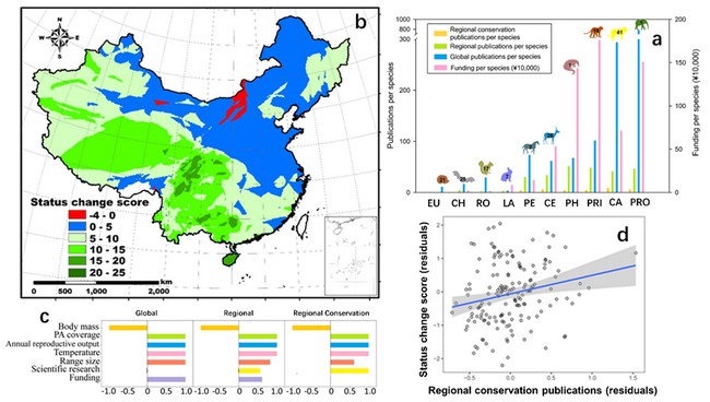 近日,我校生命科学学院范朋飞教授团队比较了2004年与2015年我国公开发布的两次物种红色名录162种陆生哺乳动物濒危等级的变化,首次量化分析了科研强度对濒危等级变化的影响。该团队将科学研究分为三个不同层次。全球研究(global research)指和某个物种相关的所有英文和中文文献;地区尺度的研究(regional research)是指包含至少一名中国科研机构作者的文献;与保护相关的地区尺度的研究(conservation-related regional research)则指发表在生物多样性保护、环境科学和生态学等领域的包含至少一名中国机构作者的文献。