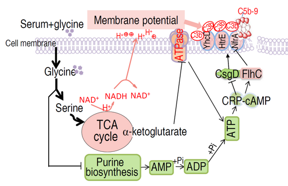 课题组基于前期在逆转细菌耐药性的研究中所创建的重编代谢组学理论和应用(Cell Metabolism, 2015, 21, 249–261; Proc Natl Acad Sci USA, 2018, 115, E1578-E1587),发现血清抗性菌最重要的代谢特征为甘氨酸-丝氨酸-苏氨酸代谢通路显著下调,采用外源甘氨酸、丝氨酸或苏氨酸重编细菌代谢组,可以大大提高对血清补体的敏感性,同时也可以提高对抗生素的敏感性。其主要机制为外源甘氨酸、丝氨酸和苏氨酸促进三羧酸循环中α-酮戊二酸的积累,以抑制ATP合酶;同时高浓度甘氨酸抑制嘌呤通路合成ATP; 使ATP合成的两条主要途径同时受到抑制,导致ATP生成下降;进而下调cAMP/CRP复合物,上调细菌外膜补体结合蛋白HtrE, NfrA和YhcD表达。高浓度的甘氨酸还可以增加质子动力势,促进血清补体与补体结合蛋白的结合,逆转血清抗性,实现血清补体高效杀菌(如上图所示)。甘氨酸促进补体杀菌在人血清、小鼠血清、猪血清、鱼血浆和对虾血浆均获得相似结果,在BALB/c小鼠和Rag1-/-(无T- 和B- 细胞免疫)细胞缺陷小鼠体内也得到证实,为控制人类和动物养殖病原菌感染提供了新的思路。