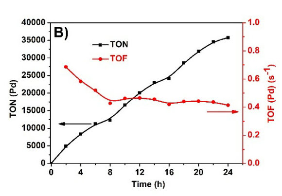 基于Pd催化中心的积累TON和TOF值(可见光照射,l > 420 nm,光强:100 mW/cm2)