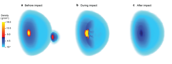 “这项研究对于系外行星的研究也有启发性意义,因为目前我们发现的几千颗系外行星中,有一部分是既知道质量也知道大小的。那么我们就能推算出系外行星的平均密度。其中有一些系外行星的平均密度很大,有一个可能的解释就是这些行星经历了行星撞击过程,导致其损失了大量的氢和氦”,刘尚飞说。
