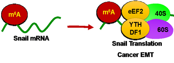 王红胜副教授课题组研究发现,在肿瘤细胞EMT过程中,mRNA的m6A修饰增加。甲基转移酶METTL3的缺失使得m6A水平下调,并抑制癌细胞在体外和体内的迁移、侵袭和EMT过程。m6A-seq和功能实验表明,EMT的关键转录因子Snail的表达受m6A调控,且过表达Snail能逆转METTL3缺失导致的细胞EMT抑制。进一步研究表明,Snail mRNA的CDS区而非3’UTR区的m6A修饰,可促进其mRNA的翻译延伸,其可能机制是通过YTHDF1与eEF-2的共结合促进多聚核糖体对其的翻译作用。体内实验表明METTL3敲除细胞株转移能力较野生型显著下调,过表达Snail则可在一定程度上逆转此现象。临床分析表明肝癌组织中Mettl3和YTHDF1表达高于癌旁组织,其上调是肝癌患者总体生存率(OS)不良预后因素。