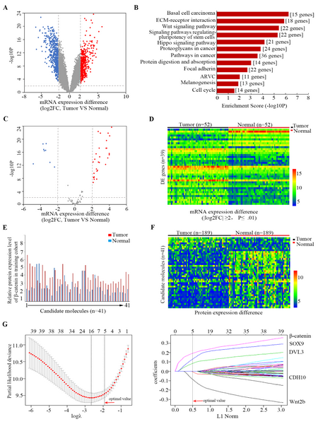 该研究旨在探索发育组信号通路在驱动基因阴性肺腺癌中的作用,并探寻与驱动基因阴性肺腺癌患者预后显著相关的分子,以期为此类预后差的病人提供新的治疗靶点。实验分为3大部分:发现阶段、实验阶段以及验证阶段。在发现阶段,课题组利用全基因组芯片对52对驱动基因阴性肺腺癌肿瘤组织和相邻正常组织进行候选基因的筛选,通过KEGG信号通路富集分析发现Wnt/β-catenin信号通路在驱动基因阴性肺腺癌中高度激活,并得到41个Wnt/β-catenin信号通路相关的差异表达基因。在实验阶段,课题组运用组织芯片技术(TMAs)和LASSO Cox回归分析进一步对41个候选基因进行筛选,最终构建了一个由CTNNB1、SOX9、DVL3和Wnt2b组成的预后相关classifier(CSDW)。依据CSDW classifier,驱动基因阴性肺腺癌患者可被分为高风险组和低风险组,并且高风险患者的总生存率显著差于低风险患者([HR]10.42,6.46-16.79;p<0 .001)。在验证阶段,课题组收集了内部验证组样本和两个独立的外部验证组样本。经过验证分析,csdw classifier被证实可作为预测驱动基因阴性肺腺癌患者预后的可靠工具,同时为驱动基因阴性肺腺癌的治疗提供新的靶点。