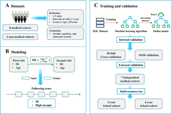 既往青少年近视眼研究数据量小,无法完全反映其发展规律,因此不能有效进行预测及早期精准干预。近视眼一旦发展为高度近视,可导致视网膜变性、脱离等不可逆损害,严重影响孩子们的身心健康。如果能够在早期预测其发展规律,通过增加户外活动等早期干预手段,就可减缓近视眼的发生发展,对降低高度近视的风险有重要意义。