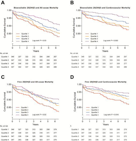 Kaplan-Meier plots for all-cause mortality (A) and cardiovascular mortality (B) according to bioavailable 25-hydroxyvitamin D [25(OH)D] quartiles, and all-cause mortality (C) and cardiovascular mortality (D) according to free 25(OH)D quartiles among patients with coronary artery disease.