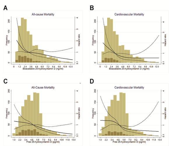 Multivariable-adjusted spline functions demonstrate the relation between bioavailable 25-hydroxyvitamin D and all-cause mortality (A) and cardiovascular mortality (B), and the relation between free 25-hydroxyvitamin D and all-cause mortality (C) and cardiovascular mortality (D). The histogram of the distribution of bioavailable or free 25-hydroxyvitamin D levels is also shown. Deaths were shown in dark brown column, and survivals were shown in light brown column.