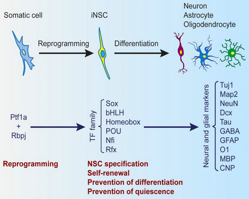 通过研究发现,利用单个视网膜转录因子Ptf1a,可以将小鼠和人的成纤维细胞在体外高效重编程为神经干细胞,并揭示了Ptf1a诱导体细胞重编程过程的内在分子机制。由于Ptf1a是一个非神经前体细胞转录因子,该发现颠覆了体细胞重编程为神经干细胞需要依赖神经前体细胞转录因子参与的认知。经过Ptf1a重编程的神经干细胞在体外可以大量传代扩增,并能在体外及体内分化成为具有功能的、各种类型的抑制性及兴奋性神经元、星型胶质细胞和少突胶质细胞。进一步的研究发现,当把这些诱导神经干细胞移植到患有老年痴呆的小鼠模型大脑中,其可以分化并整合到大脑中,和原有的脑细胞形成功能性连接。行为学测试表明,细胞移植可以明显改善患病小鼠的空间学习及记忆功能。