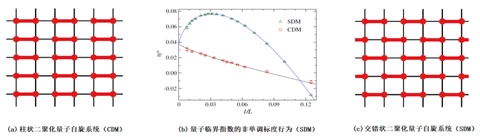 姚道新教授研究组与合作者深入研究了二维二聚化量子自旋系统,通过理论分析和高精度的量子蒙特卡洛方法,发现在交错状二聚化量子海森堡模型中,相变临界指数具有新奇的非单调尺寸标度行为。他们通过在有限尺寸标度理论中引入两个驱动场,同时进行大尺寸的计算分析,成功地解释了非单调的量子蒙特卡洛结果,从根源上指出二维二聚化量子自旋系统的相变仍然属于O(3)普适类,适用于量子-经典对应理论。他们的研究表明,在量子相变中可能存在多个驱动场导致的新奇标度行为,需要采用正确的标度理论才会得到正确的结果。在论文中,他们还创造性地提出多参数联动-高阶拟合方法,能极大地提高数据准确度,可以用在不同体系的数据分析中。