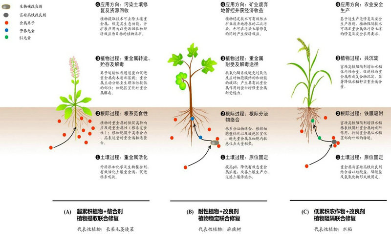仇:首先,团队在以植物稳定为核心的高污染土壤联合修复技术方面,筛选了一批能成功应用于重金属固定的能源植物及经济植物(图3),在国际上最先定量研究和表征了生物炭与重金属的表面反应机制;在固定重金属的同时,解决了长期困扰水处理行业的污泥出路,实现了以废治废;构建了化学/微生物辅助植物稳定修复矿山高污染土壤技术模式,提出“耐性植物+改良剂”为代表的重金属高污染土壤植物稳定联合修复模式,高效实现多金属矿区重金属源头控制。