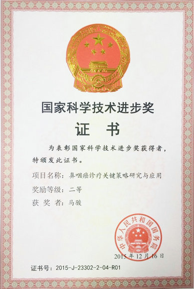 “鼻咽癌诊疗关键策略研究与应用”获得2015年国家科技进步二等奖(第一完成人)