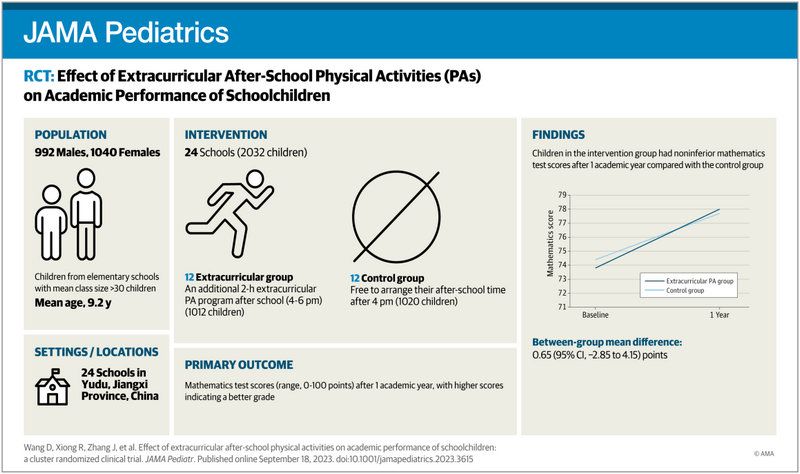 日前,研究结果的论文在JAMA Pediatrics在线发表“Effect of Extracurricular After-School Physical Activities on Academic Performance of Schoolchildren: A Cluster Randomized Clinical Trial”。