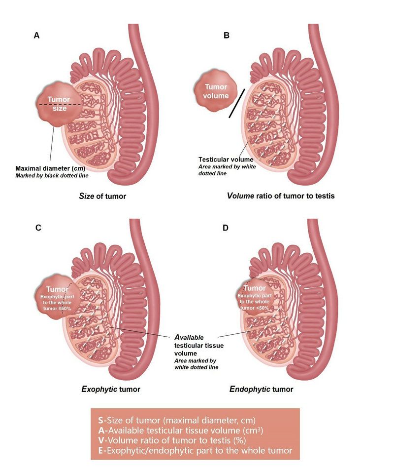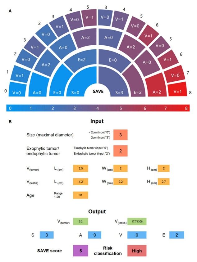 团队提出了保留睾丸量化评分工具——SAVE评分系统,用于评价保留睾丸手术的可行性。其基于睾丸肿瘤的四个关键且简便的解剖特征:肿瘤大小(S)、睾丸正常组织体积(A)、肿瘤与睾丸的体积比(V)以及肿瘤的外生/内生性质(E)。