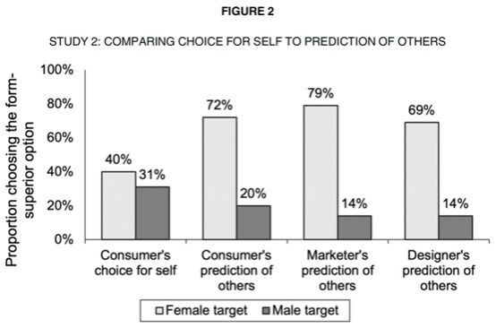 为了检验上述假设,作者进行了七项实验和四个后续实验。研究发现在面对产品外形和功能权衡时,人们为他人和为自己作出的产品决策存在显著的不一致(实验1、2、5A、5B),即人们更倾向于为女性他人(vs.男性他人)选择外形优越(vs.功能优越)产品,但为自己选择时则无性别差异,这个结论不仅适用普通消费者(实验1、2、5A、5B、后续实验1)还适用于市场营销人员及产品设计人员(实验2,如下图)。