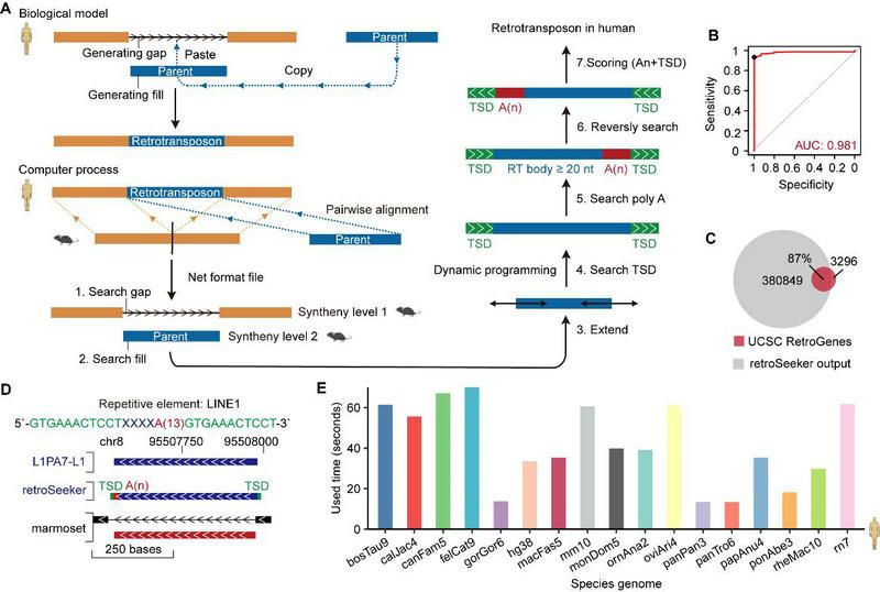 近日,best365中国官方网站生命科学学院杨建华/屈良鹄教授团队开发了在全基因组检测逆转录转座子的新计算方法retroSeeker。通过将逆转录转座子事件的生物学模型(复制-粘贴)映射到比较基因组学数据(gap和fill)中,retroSeeker算法能够准确地识别任何物种基因组中的新逆转录转座子。具体而言,亲本基因的存在产生了一个“填充”(fill)区域,而“复制-粘贴”过程则在新的基因座产生了一个“间隙”(gap)区域,通过将物种间的基因组进行两两比对,可以复现这些“填充”和“间隙”区域以获得候选的转座子区域 (图1A)。此外,根据逆转录转座的TPRT(target-site primed reverse transcription)机制,逆转录转座子的复制往往还需要借助其poly(A) 尾巴,且在插入新基因座后,逆转录转座子两侧还会形成标志性的TSD(target site duplications)序列。因此,一旦retroSeeker确定了潜在的逆转录区域,它会立即利用动态规划算法对侧翼的TSD和poly(A)序列进行搜索和评分,最终获得高置信度的逆转录转座子候选 (图1A)。通过模拟数据和真实数据的测试,retroSeeker算法表现出高度特异性、高灵敏度和快速的运行速度。(图1B-E)。