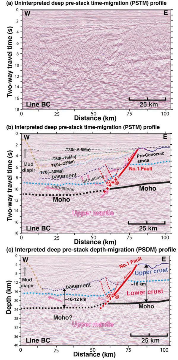 图3 (a)未解释的深反射叠前时间偏移剖面BC。 (b)解释的深反射叠前时间偏移剖面BC。(c) 与图3b类似,但是为叠前深度偏移剖面BC。图中文字与符号说明与图2一致。