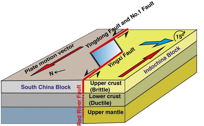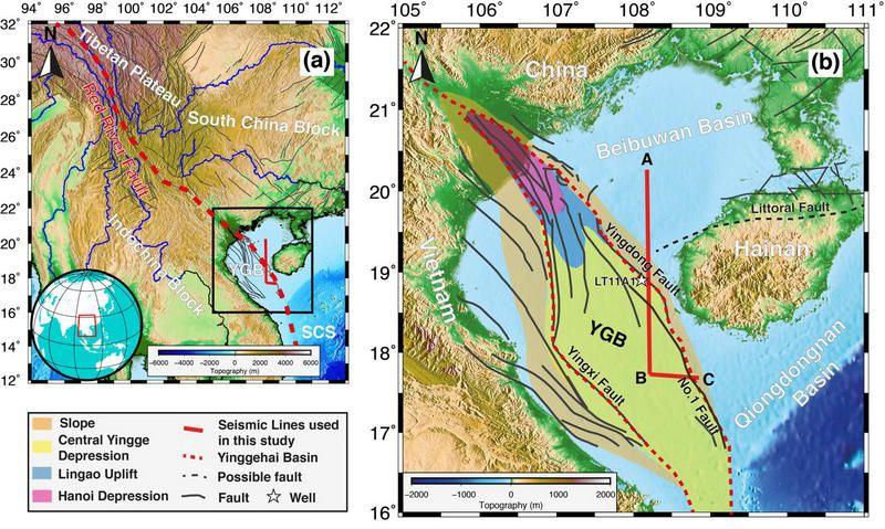 中大新闻网讯(通讯员李伦)印度板块与亚洲板块的碰撞不仅形成了世界上最高与巨厚地壳的青藏高原,还导致高原物质向外逃逸。前人研究提出了两种端元模型来解释青藏高原物质是如何逃逸的。其中一种是大陆挤压模型,该模型提出青藏高原是沿着几条岩石圈尺度走滑断裂向外逃逸,其中该模型预测红河断裂是青藏高原物质向东南逃逸的一条岩石圈尺度断裂;另外一种是地壳流模型,该模型提出青藏高原物质主要是以中下地壳流方式向外逃逸。发育在青藏高原北部金沙江缝合带并向东南延伸,经过红河至莺歌海盆地延绵~1000公里长的红河断裂被认为是这些大规模走滑断裂中一条规模巨大的断裂。因此,精细探测红河断裂的属性(几何结构、变形样式和深度延伸)是揭露青藏高原物质向东南方向逃逸过程的关键。
