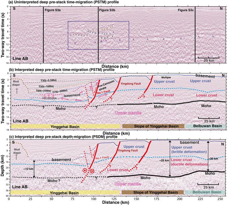 图2 (a)未解释的深反射叠前时间偏移剖面AB。紫色三角形指向莫霍面反射信号。蓝色方框标记了红河断裂北支一号断裂下方地壳内部不连续与错断的反射同相轴,指示了红河断裂(即一号断裂)的剪切作用形成了该区域复杂的反射地震信号。(b)解释的深反射叠前时间偏移剖面AB。红色(实线和虚线)表示解释的深大断裂。不同颜色的细虚线标记了地层边界。蓝色实线和虚线代表解释的沉积盆地基底。黑色实线和虚线代表解释的莫霍面边界。较粗的浅蓝色虚线代表上地壳和下地壳的边界。粉红色箭头指示岩浆侵入的可能路径,粉红色虚线表示岩浆侵入的顶部。Basement:沉积盆地基底;Upper crust:上地壳;Lower crust:下地壳;Moho:莫霍面;No. 1 Fault: 一号断裂,即红河断裂在莺歌海的北支;Yingdong Fault:莺东断裂;Intrusions:岩浆侵入;Upper mantle:上地幔。(c)与图2b类似,但是为叠前深度偏移剖面AB。图中数字代表地壳厚度。