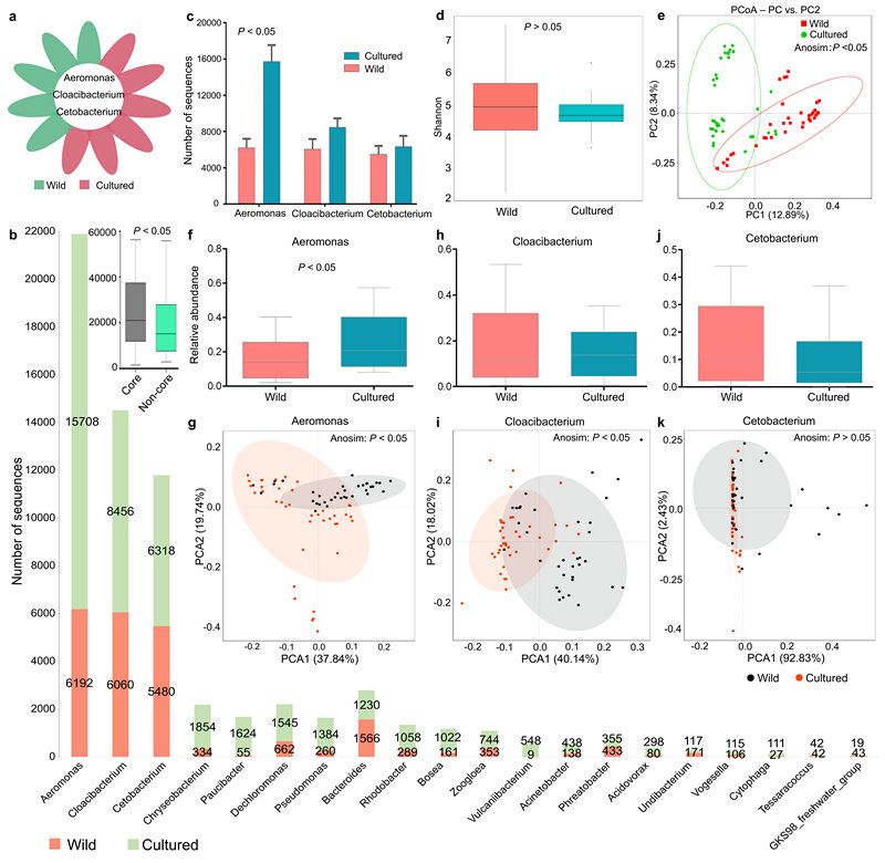 该研究揭示了以下重要发现:(a) 野生和饲养的腹足纲动物的肠道微生物群落存在显著差异,不同的腹足纲动物种类都存在肠道核心微生物Aeromonas、CloacibacteriumCetobacterium;(b) 在腹足纲动物中,尽管水平传递占据了大部分肠道菌群的传播比例,但约43%的肠道微生物可以在非无菌环境中通过垂直传递的方式遗传给下一代;(c) 在非无菌条件下,野生腹足纲动物的肠道微生物可以维持长达2代,之后F3和F4代的肠道菌群的组成会逐渐与饲养的腹足纲动物肠道菌群趋同;(d) 肠道菌群的趋同进化可能有助于腹足纲动物从野生环境到养殖环境的适应性进化,并且这一过程与代谢功能相关;(e) 垂直传递而不是水平传递推动了肠道菌群的趋同进化,促进宿主健康。这表明肠道微生物群落结构的变化可以作为宿主健康水平或当前状态的潜在指标;(f) 发现核心微生物AeromonasCloacibacterium不仅能够跨多子代垂直传递,还可在宿主不同发育阶段中纵向传播,为肠道定植菌。