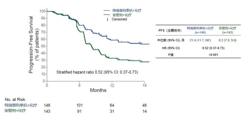 特瑞普利单抗联合化疗组中位缓解持续时间是化疗组的3倍,获得更持久的缓解。两组的中位缓解持续时间分别为18.0 vs. 6.0个月,HR=0.49(95% CI: 0.33-0.72)。