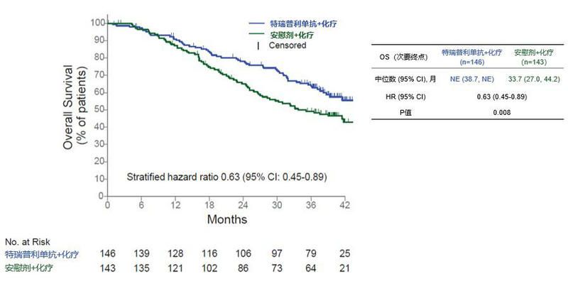 截至2021年6月8日,特瑞普利单抗联合化疗组较安慰剂联合化疗组的客观缓解率有所提升,分别为78.8% vs. 67.1%;尤其是,特瑞普利单抗组的完全缓解率是单纯化疗的2倍(26.7% vs. 13.3%)。