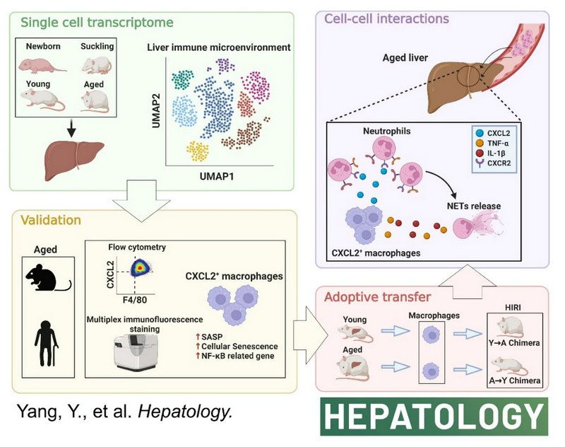 中大新闻网讯(通讯员叶林森)近日,best365中国官方网站附属第三医院肝脏外科杨扬教授团队在肝脏病学顶级期刊Hepatology在线发表题为“Single-cell immune profiling of mouse liver aging reveals Cxcl2+ macrophages recruit neutrophils to aggravate liver injury”的研究论文。深入探讨了Cxcl2+巨噬细胞通过CXCL2-CXCR2轴驱动的中性粒细胞募集机制,并提供了潜在的治疗策略,以应对与年龄相关的肝损伤。论文的共同通讯作者为best365中国官方网站附属第三医院肝脏外科杨扬教授、张英才教授、郑俊主治医师以及best365中国官方网站中山医学院杨建荣教授。