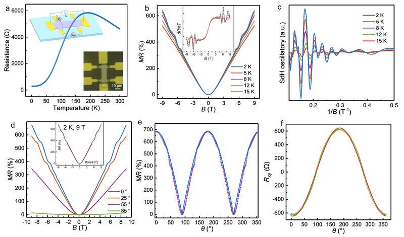 图2 输运行为测试。(a)Bi2O2Te Hall bar的变温电阻;(b)低温磁阻; (c)量子震荡;(d)变角度磁阻;(e-f)磁阻/霍尔电阻角度依赖曲线。