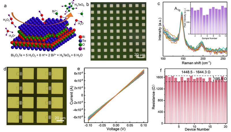 图1 样品均一性表征。(a) Bi2O2Te的刻蚀示意图; (b) Bi2O2Te阵列; (c)拉曼光谱均匀性测试;(d)两端器件阵列;(e-f)两端器件IV曲线以及电阻分布。