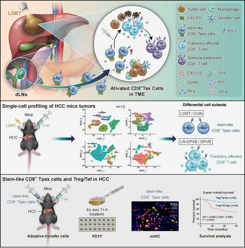 本研究在多种临床前肝癌模型中发现低剂量放疗(Low-dose Radiotherapy, LDRT)可以明显增强双重程序性细胞死亡配体-1 (Programmed cell death 1 ligand 1,PD-L1) 和血管内皮生长因子A (Vascular endothelial growth factor A, VEGFA) 阻断 (Dual PD-L1 and VEGFA Blockade, DPVB) 的抗肿瘤作用。该联合治疗显示出显著的CD8+ T细胞介导的抗肿瘤治疗疗效。高通量单细胞RNA测序和多种实验结果显示,LDRT联合DPVB增强了肿瘤排斥的耗竭样CD8+ Tex的效应功能和细胞毒性。此外,利用多个肝癌临床前模型和体外肿瘤片段平台(Patient-derived tumor fragments, PDTFs) 进行疗效机制深入研究,结果表明LDRT通过CXCL10/CXCR3轴促进干细胞样祖耗竭性CD8+ Tpex从引流淋巴结向瘤内募集进而增敏DPVB的机制。该研究对于提高不可切除肝细胞癌的联合治疗疗效提供了可靠的临床前证据。
