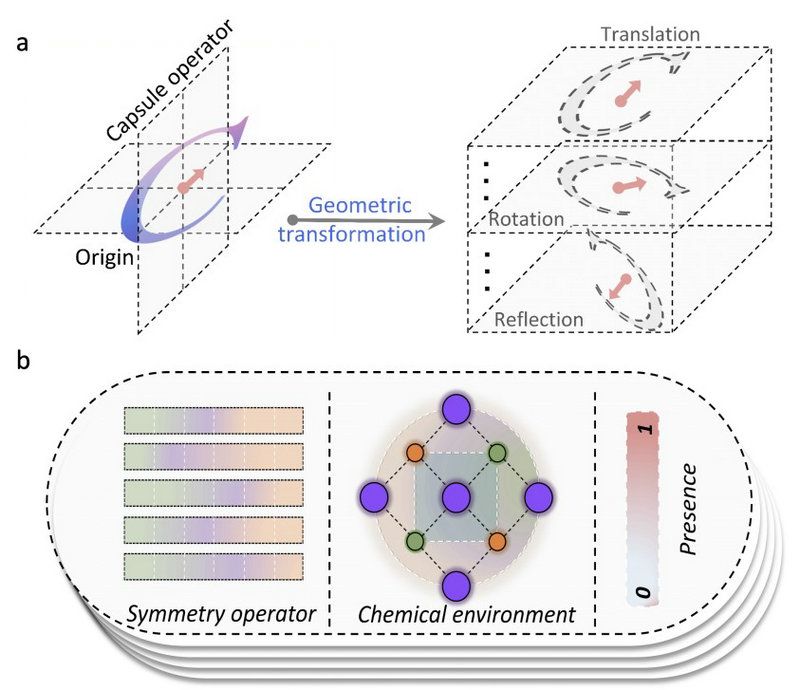 基于统计机制的机器学习(ML)方法最近被广泛应用于物理、材料等研究中,以实现准确的性能预测和逆向设计。由于晶体对称性是凝聚态系统的基本属性,针对对称性的感知与识别对于准确预测材料电学性质和微观响应至关重要。然而由于卷积神经网络在感知对称性方面的固有缺陷,现有的ML算法仍然很难感知空间群中全部对称性变换。即使晶体对称性被隐式地包含在由图模型生成的材料表征中,空间特征仍会由于卷积操作而缺失对于旋转、反射、螺旋轴与滑移面等复杂变换的检测。因此,准确识别晶体对称性并强化属性预测是突破当前ML算法缺陷并增强可解释性与泛化性的关键。