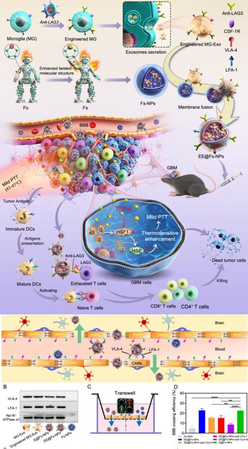 研究团队开发了一种外泌体药物递送平台,该平台能够跨越血脑屏障并特异性地靶向胶质母细胞瘤,研究团队通过基因工程的方法将免疫检查点抗体anti-LAG3表达在小胶质细胞外泌体上而制备了工程化小胶质细胞外泌体,同时将光敏剂载入表达anti-LAG3的工程化外泌体中而形成EE@Fs-NPs。由于工程化小胶质细胞外泌体膜上表达整合素蛋白VLA-4和LFA-1能够打开血脑屏障形成“绿色通道”,从而使EE@Fs-NPs顺利进入脑部。此外,工程化小胶质细胞外泌体使EE@Fs-NPs特异性靶向胶质母细胞瘤,因此,EE@Fs-NPs成功将免疫检查点阻断抗体和光热剂递送到肿瘤部位。免疫检查点阻断抗体anti-LAG3逆转T细胞耗竭状态,联合在激光照射下EE@Fs-NPs能产生温和光热治疗,提高胶质母细胞瘤对免疫检查点阻断疗法的响应度以及不会产生耐药性,实验表明温和光热-免疫联合治疗显著性提高胶质母细胞瘤的治疗效果。