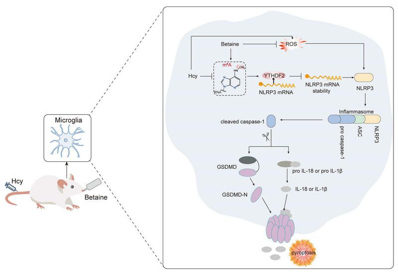 痴呆症是一个全球主要的公共卫生问题,精确预防和控制重要风险因素有助于预防或减缓痴呆症的发展。血同型半胱氨酸水平升高是老年痴呆可改变的重要风险因素, 降低血同型半胱氨酸水平至关重要。甜菜碱也称为三甲基甘氨酸,是一种重要的甲基供体,在藜麦、虾、甜菜和菠菜中含量丰富。基于课题组前期的研究成果,在新版《中国居民膳食营养素参考摄入量2023版》中把甜菜碱纳入了其它膳食成分并制定了降同型半胱氨酸的特定建议值(SPL)。然而甜菜碱对同型半胱氨酸引起的认知障碍的作用和机制尚不清楚。本研究利用同型半胱氨酸诱导认知障碍模型,结果发现补充甜菜碱可以增强大鼠的学习记忆能力,减少脑损伤。甜菜碱还在体外和体内抑制小胶质细胞活化和细胞焦亡。从机制上讲,甜菜碱提高了炎症小体NLRP3 mRNA的m6A甲基化水平,并增加m6A阅读器YTHDF2的表达来并降低NLRP3 mRNA的稳定性,最终抑制NLRP3/caspase-1/GSDMD通路。