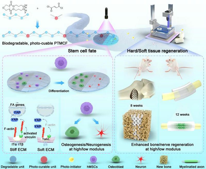 在此研究工作中,王山峰教授团队开发了一种新型的可光固化聚合物聚三亚甲基碳酸酯富马酸酯(PTMCF,中国发明专利申请号:202011000150.4),通过面投影微立体光刻技术(PμSL)制备了具有单因素变量(模量)的二维基底和三维支架,并用于研究模量对体外人源间充质干细胞行为以及体内软硬组织再生的影响。得出的主要结论如下:(1)将线性PTMC二醇与富马酰氯进行缩聚得到了可光固化可降解的无定形PTMCF。PTMCF的低玻璃化转变温度和低零剪切黏附特性使其可在高固含量下PμSL打印为生物弹性体。PTMCF交联网络性质如玻璃化转变温度、拉伸模量和降解速率均与随交联密度增加而升高。(2)在拉伸模量位于90-990 kPa范围内,人源间充质干细胞(hMSCs)粘附、铺展和增殖与模量呈正相关;而hMSCs成骨或神经元分化分别在990 kPa和90 kPa基底上得到增强,模量通过介导YAP转录活性调控粘着斑蛋白形成以及后续的细胞行为。(3)当支架压缩模量处于85-580 kPa范围内,大鼠股骨髁修复与支架模量呈正相关;而其周围神经修复与支架模量呈负相关。通过转录组学得到的模量介导周围神经修复潜在机制:适宜的模量可促进细胞整合素表达,激活FAK磷酸化并进一步活化Rho家族蛋白,从而激活下游蛋白以形成Arp2/3复合物,促进肌动蛋白成核与聚合,并形成丝状伪足、微突起和板状伪足,促进神经元生长并进一步修复周围神经。
