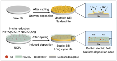 近期,该团队针对钠金属负极所面临的瓶颈,利用室温原位置换反应在钠金属表面可控制备了一种独特的修饰层。在修饰层底部的Ag纳米粒子可以作为有效的成核位点,诱导Na+均匀沉积。而修饰层内部的Ag纳米粒子与钠金属之间由于具有电势差,形成的内建电场会加快Na+在人工界面层中的迁移速率,减小电极极化,进而抑制副反应。这些协同作用使修饰后的钠金属负极在非常苛刻的条件下稳定运行。特别是钠金属对称电池可以在电流密度高达10 mA cm−2的条件下,可逆剥离/沉积长达1000小时以上。匹配高载量磷酸钒钠正极(20 mg cm−2)的钠金属全电池也能实现稳定循环。该工作为构建高性能钠金属电池提供了新思路。