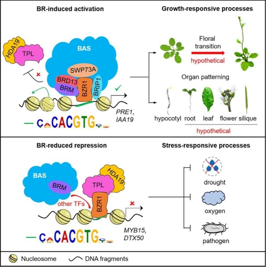 研究发现BR能够在拟南芥全基因组水平重塑染色质可及性,即增加BR诱导基因的染色质可及性,同时降低BR抑制基因的染色质可及性。进一步研究发现BZR1与BAS染色质重塑复合体相互作用并且特异地招募BAS到BR激活基因上提高染色质可及性进而激活转录。相反,BAS的缺失并不会损坏BZR1降低染色质可及性和抑制BR响应基因表达的能力,表明BAS染色质重塑复合体决定了BZR1的转录激活能力。最后,生理实验证明BZR1-BAS转录激活复合体介导的BR响应基因的激活对于植物的暗形态建成和正常的生长发育是不可或缺的。