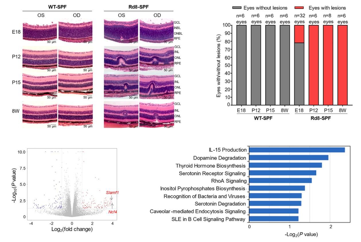 在胚胎阶段并非所有Rd8小鼠都存在视网膜发育不良,但在出生后12天小鼠都出现了典型病变。RNA测序发现,Rd8小鼠视网膜中Slamf1和Ncf4这类“细菌与病毒识别”有显著关联的基因表达增高,促炎基因以及小胶质细胞和巨噬细胞浸润基因也显著上调,提示Rd8小鼠视网膜变性存在病原体的参与,而且伴有局部的先天免疫反应。
