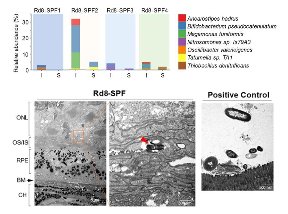 通过对Rd8小鼠视网膜宏转录组测序发现,有7种细菌现身于视网膜变性区域,其中多达5种是已知的肠道细菌。