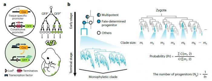 中大新闻网讯(通讯员熊丽娜)在成熟的多细胞生物体内,具有特定功能的细胞群通常源自于一组祖先细胞。细胞群体的谱系多样性是由这些祖细胞的数量决定的,因此估计祖先细胞群体数量是发育生物学的重要研究问题之一。而传统的研究手段主要依赖于组织特异性的启动子介导报告基因的表达,进而对目标细胞群体进行计数。这一类研究手段的可靠性高度依赖于启动子的选择,其中,启动子的组织特异性与时空表达动态都会使估计结果产生偏差。