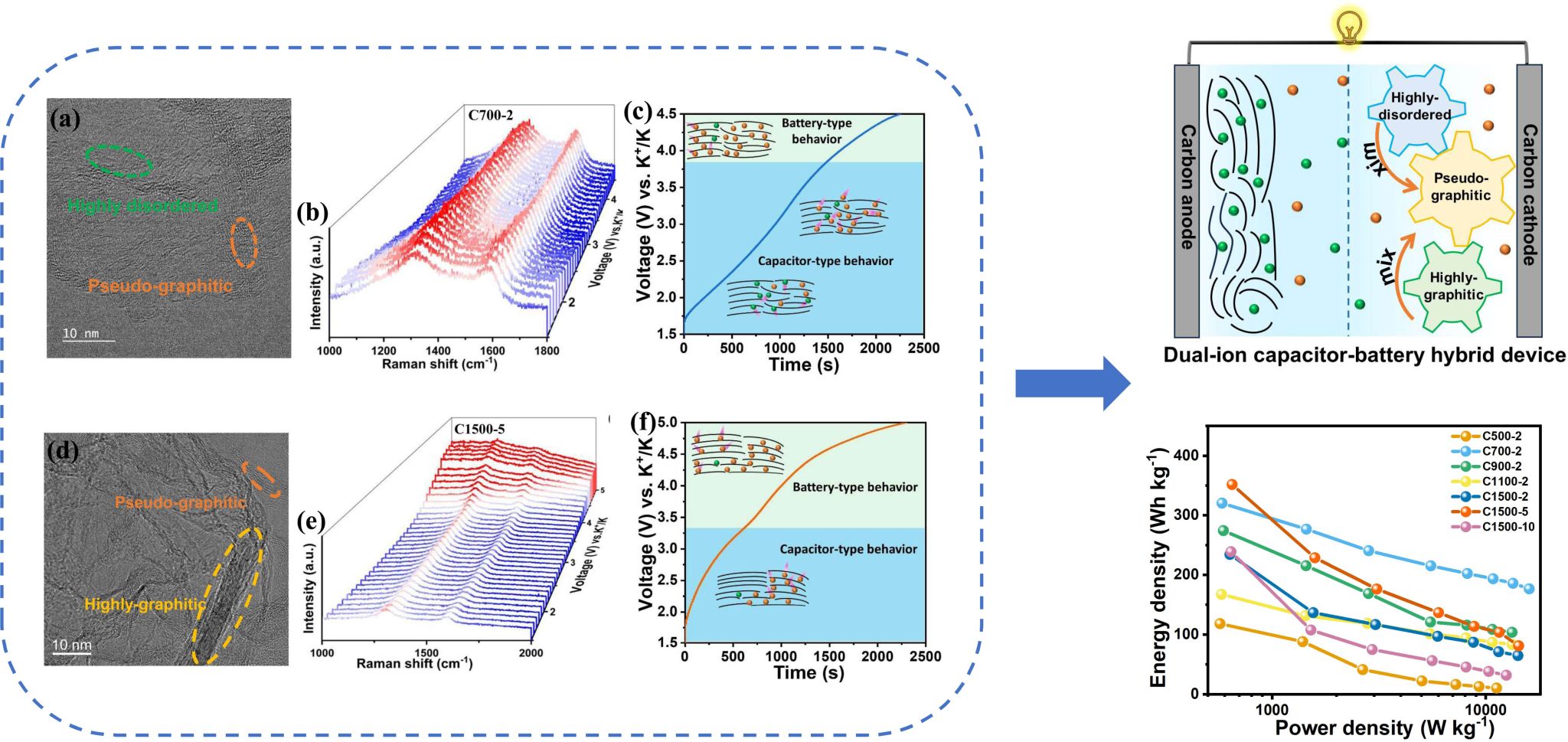 材料科学与工程学院阎兴斌教授团队针对上述问题,通过调控碳正极的微观结构,制备了一系列具有不同微观结构的碳正极材料,实现了双离子电容器-电池混合器件 (DICB) 的构建,并通过对混合器件动力学和储能机理的研究,得出以下主要结论:1) 具有高度无序化和赝石墨混合微观结构的碳正极材料,可以使构建的DICB在1.5-4.5 V下可获得高能量 (320.4 Wh kg-1) 和高功率密度 (15.9 kW kg-1); 2) 采用赝石墨和类石墨混合结构的碳正极在1.5-5.0 V的电压范围内可进一步提高DICB的能量密度 (351.7 Wh kg-1),3) DICB同时实现较高的能量和功率密度主要归因于:碳正极的混合微观结构使DICB在不同的电压范围内实现了不同的储能机制,电容型储能机制可以在高无序和赝石墨化的碳结构中进行,电池型储能机制可以在赝石墨化和类石墨的碳结构中进行。