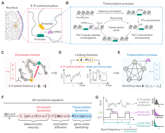 近日,best365中国官方网站数学学院张家军教授团队开发了一个通用的理论框架,该框架整合了快时间尺度上的染色质空间运动和慢时间尺度上的基因转录爆发过程(图1),并且这一框架可以被公式化为四维核体方程(4D nucleome equation)。课题组研究人员使用这一框架来分析转录爆发在空间和时间上的动态行为,即四维转录爆发动力学。模型分析和数值模拟揭示了幂律行为可以作为定性描述E-P空间通讯调控转录爆发的一般规律。具体地,E-P通讯强度通过正指数幂律上调爆发频率和爆发大小。对标度指数的分析进一步理论揭示了E-P通讯主要调控爆发频率。其次,E-P基因组距离通过负指数幂律下调转录爆发动力学,并且这种负调控在大的E-P基因组距离下达到饱和。爆发频率(或爆发大小)和E-P空间距离之间的互信息进一步揭示了从E-P通讯到转录爆发动力学信息传递的本质特征。这些发现与实验观察结果一致,不仅揭示了转录爆发中E-P通讯的基本原理,而且对理解细胞决策至关重要。