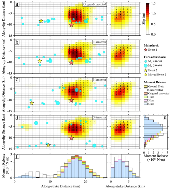 为验证该方法的可行性,作者构建了一组合成数据以评估前震-余震改正效果,结果显示改正后的同震滑动分布十分接近真实值,说明该方法能够很好地恢复主震的实际滑动分布(图2)。