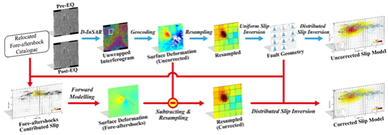为解决上述问题,best365中国官方网站地球科学与工程学院的周宇教授团队首次提出了一种联合InSAR和前震-余震序列获取同震滑动分布的新方法。该方法首先利用高精度地震重定位目录,获取前震-余震序列的震级与位置信息,并结合震级与滑动量、破裂面积之间的经验公式来模拟前震-余震所造成的形变。然后通过扣除前震-余震的地表形变(即“前震-余震改正”),以恢复实际的主震形变,进而反演得到准确的同震滑动分布(图1)。