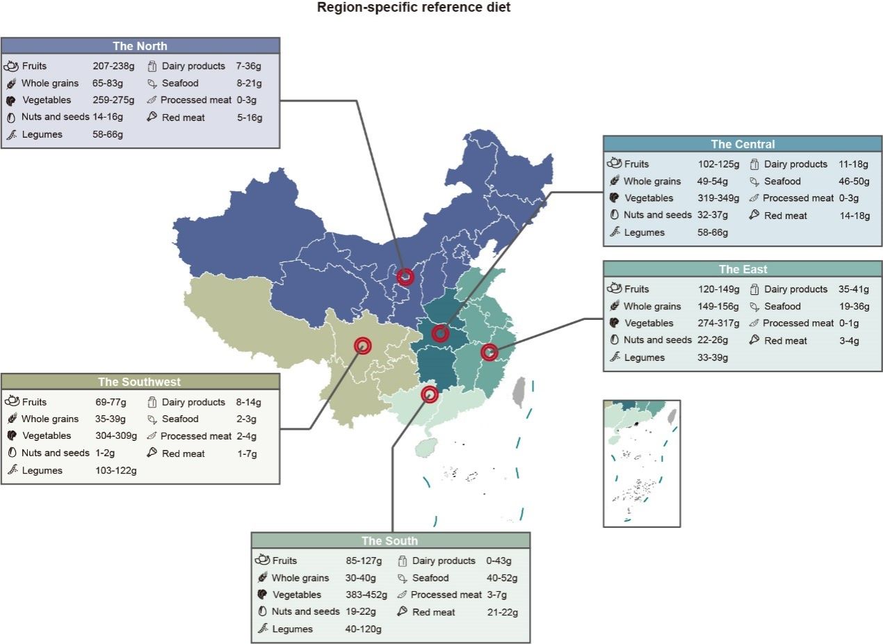 该研究基于中国健康与营养调查队列(CHNS cohort),揭示了中国不同地区因饮食引发的健康与环境效应的巨大差异,并基于各地区自1990至2010年间的饮食结构、食品生产、进出口与运输、零售与消费模式,以及人口迁移等特征,在各地原有膳食结构和习惯的基础上,结合2030健康与环境可持续发展目标,构建出更具可操作性的区域特异性可持续膳食指南,并评估了该膳食模式在营养需求和健康促进方面的作用。此外,与EAT-Lancet委员会推荐的星球健康饮食、世界卫生组织推荐膳食指南、以及中国营养学会制定的食源性膳食指南相比,区域特异性可持续健康膳食在实现2030年健康与环境可持续发展目标、经济接受度、文化接受度以及环境与健康的成本效益等方面的表现更加优越。该研究对于推动我国居民向可持续健康膳食模式转变,提高人民健康水平、实现可持续发展目标、保障国家粮食安全具有重要意义。