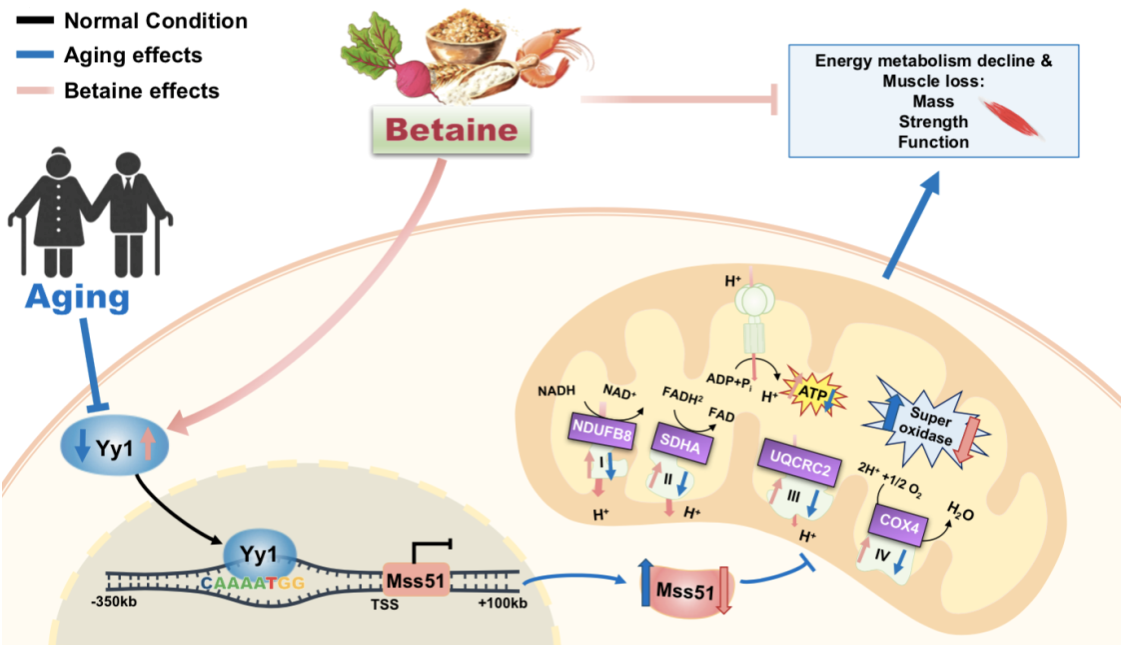 最近,best365中国官方网站公共卫生学院朱惠莲教授团队在老年医学权威期刊Journal of Cachexia, Sarcopenia and Muscle发表了题为“Betaine delays age-related muscle loss by mitigating Mss51-induced impairment in mitochondrial respiration via Yin Yang1”的原创性研究论文,揭示了天然膳食成分甜菜碱能通过转录调控,改善衰老过程中线粒体呼吸功能,发挥延缓肌肉衰减的作用。