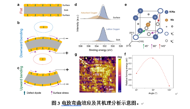 在上述研究的基础上,为了探讨表观电致应变的厚度依赖性,研究团队创新性地引入激光扫描测振技术,首次直接观察到了薄KNN陶瓷样品在电场下的实时形变行为。令人惊讶的是,陶瓷在电场下并未出现传统的均匀拉伸变形,而是表现出一种新颖的弯曲变形。在交变电场下,陶瓷显示出不同方向的交替弯曲(可控凸-凹变形)。通过分析,研究团队发现缺陷偶极子在陶瓷表面层更易于形成,且取向朝内的缺陷偶极子具有较低的缺陷形成能,趋向于朝向陶瓷内部。因此,表面层缺陷偶极子在外电场下产生的不对称响应所造成的应力差异,从而引发了陶瓷的弯曲。这种弯曲变形是所观察到的大表观应变的原因,揭示了超高电致应变的物理本质。