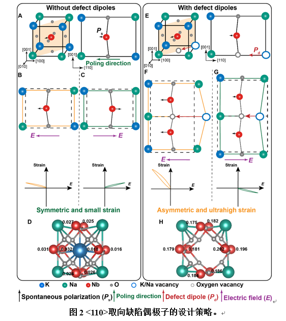 为增强缺陷偶极子与自发极化之间的相互作用,团队设计了<110>取向的缺陷偶极子。研究表明,由于<110>方向与正交相KNN陶瓷中的自发极化平行,该取向的缺陷偶极子与自发极化之间的相互作用力是传统<001>取向的缺陷偶极子的3倍。这一设计不仅提高了压电陶瓷的电致应变,还发现缺陷偶极子引起的超高表观应变存在明显的厚度效应,为理解缺陷偶极子在材料中的分布及其在电场下的响应行为提供了新的启示。